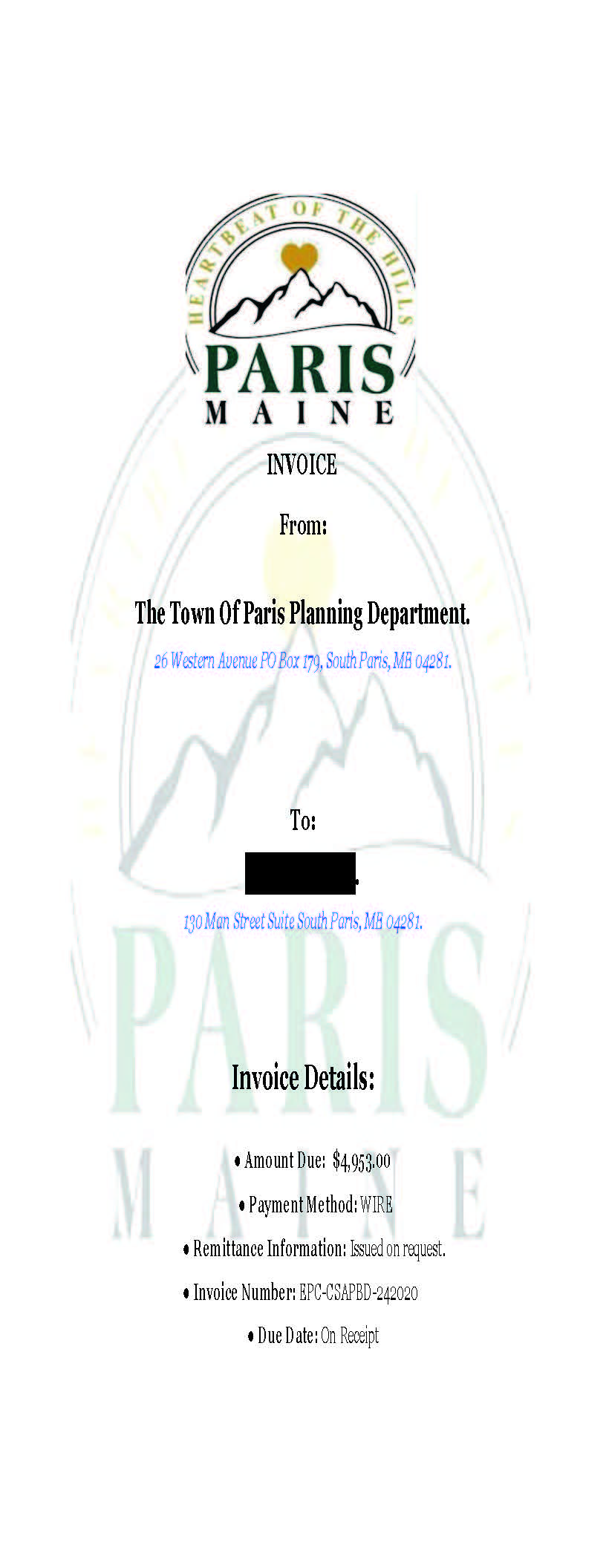 The Town of Paris is alerting residents and recent applicants that a fraudulent invoice falsely claiming to be from the Paris Planning Board has been sent to a recent applicant.