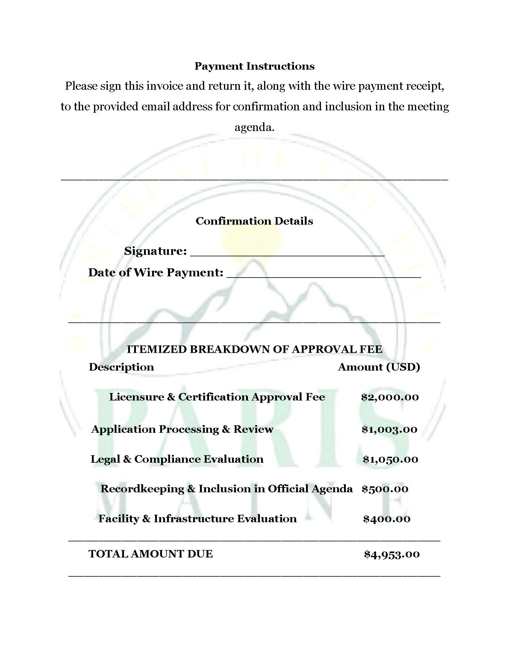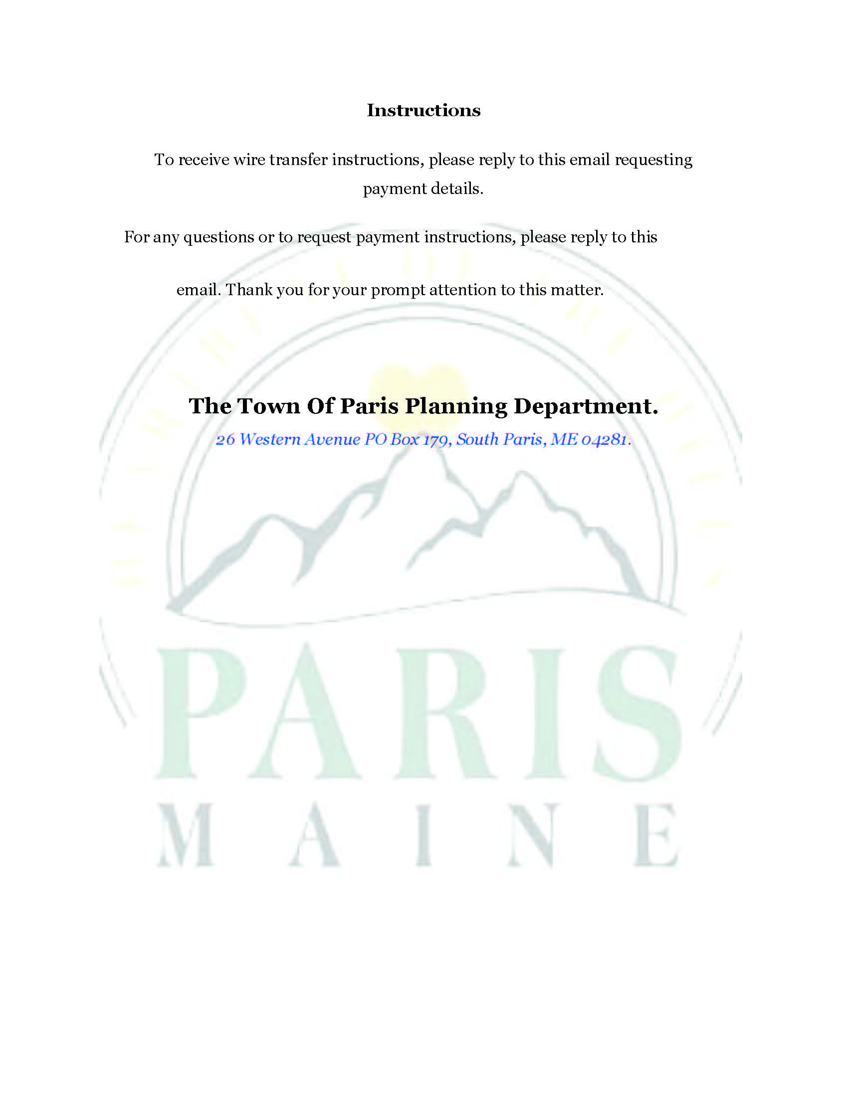 The Town of Paris will not request payment by wire transfer and will only communicate official fees through verified channels.
